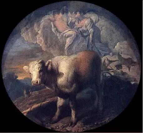 就在这时,天后赫拉在天上发现了这团黑黑的浓雾,料想一定是宙斯在搞鬼,于是也降下凡间,来到黑雾前。赫拉的出现让宙斯慌了手脚,情急之下,他将伊娥变成了一只雪白的小母牛。黑雾渐渐褪去,赫拉发现宙斯牵着一只俊俏的小母牛站在自己面前。但是,她早已识破了宙斯的把戏,温柔地对宙斯说:“伟大的宙斯啊,这只小母牛真是太可爱了,你能不能把她作为礼物送给我呢?我将非常感激。”宙斯无法拒绝赫拉的请求,只好勉强同意了。